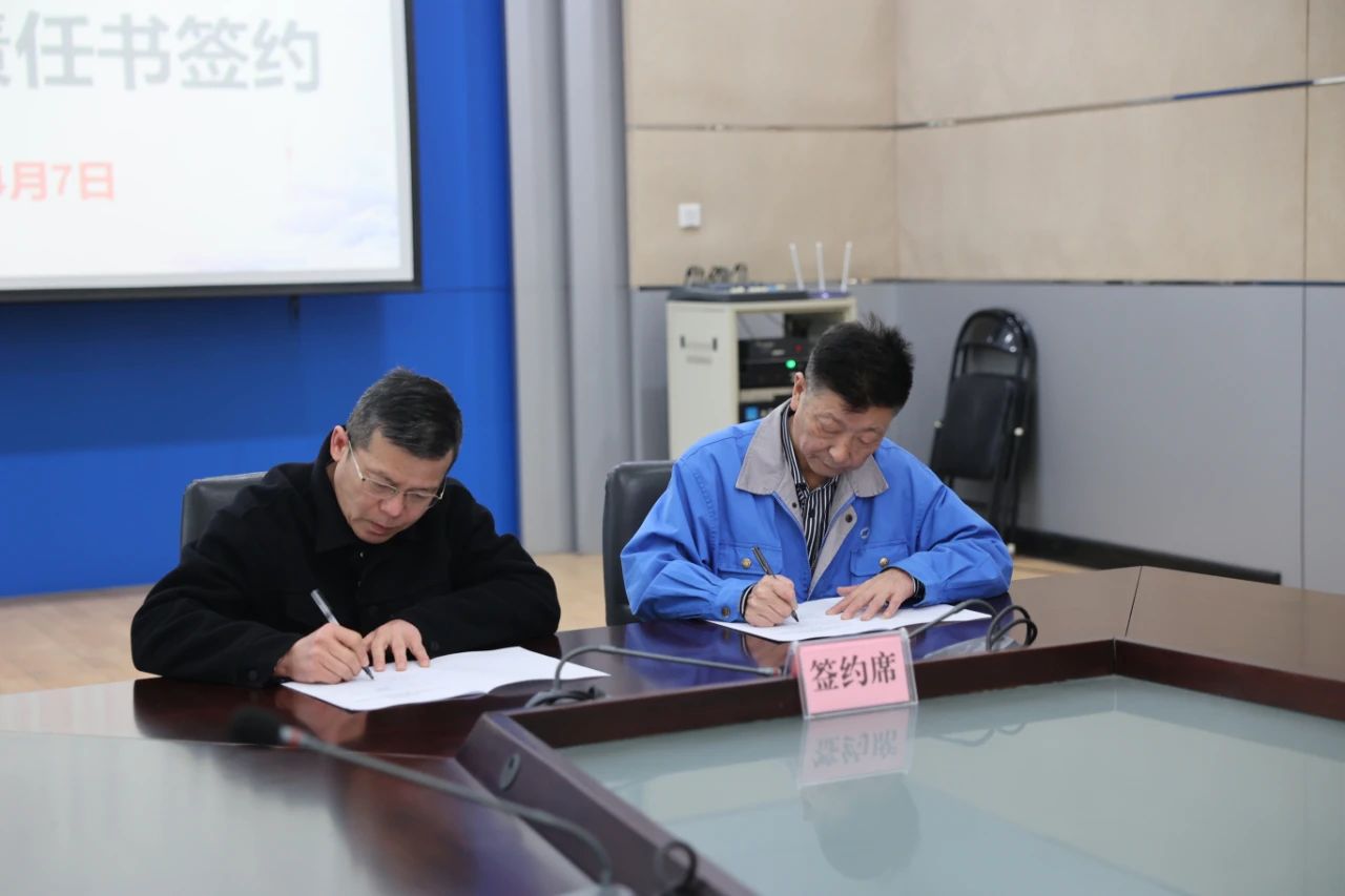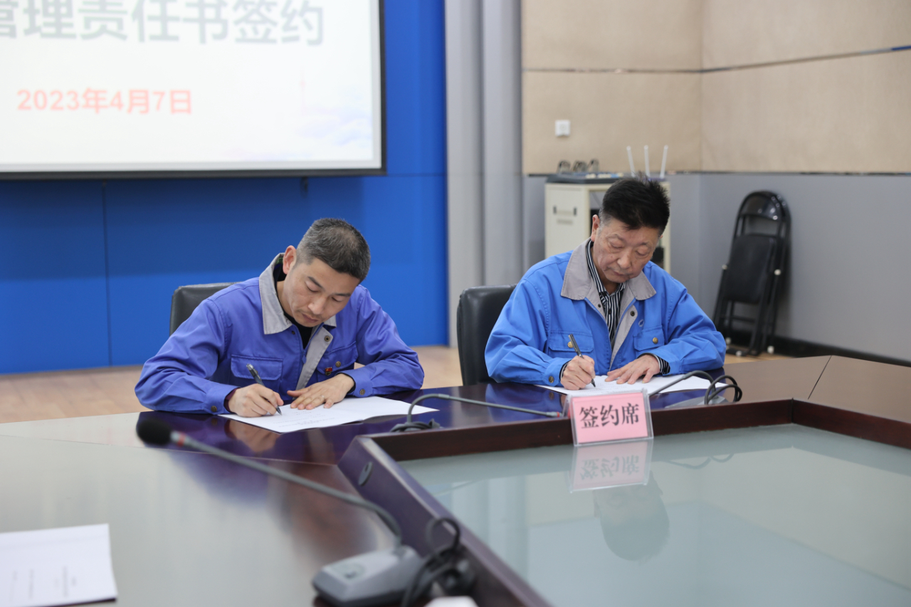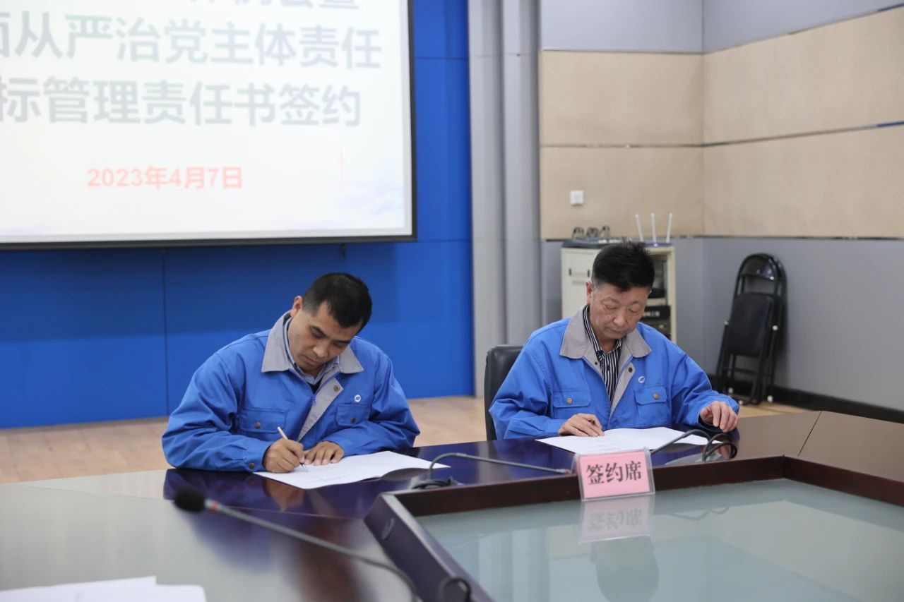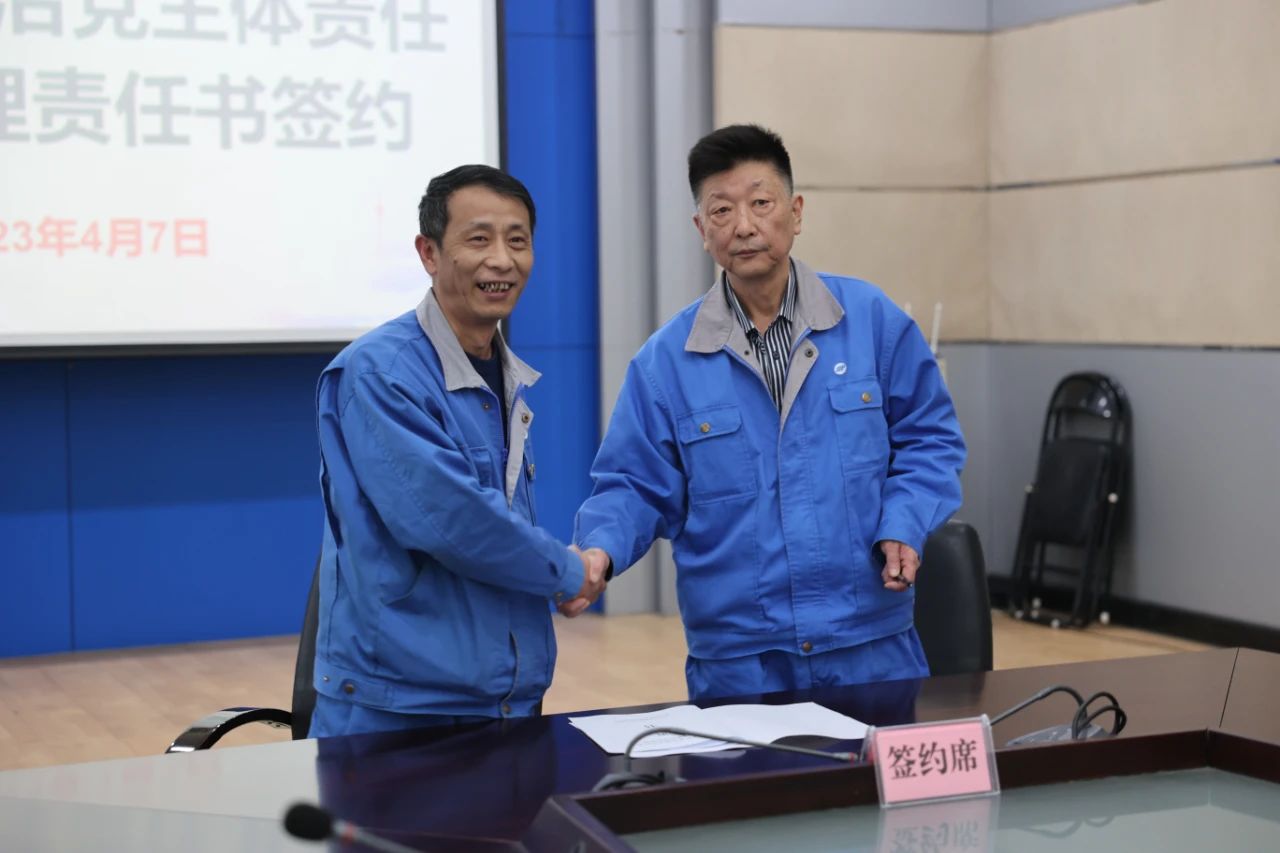 在签约环节,曹继华分别与二分厂、海盐分公司、机修分厂、嘉兴民丰医院4家单位的党支部书记、行政主要负责人,进行《2023年度全面从严治党主体责任目标管理责任书》现场签约。