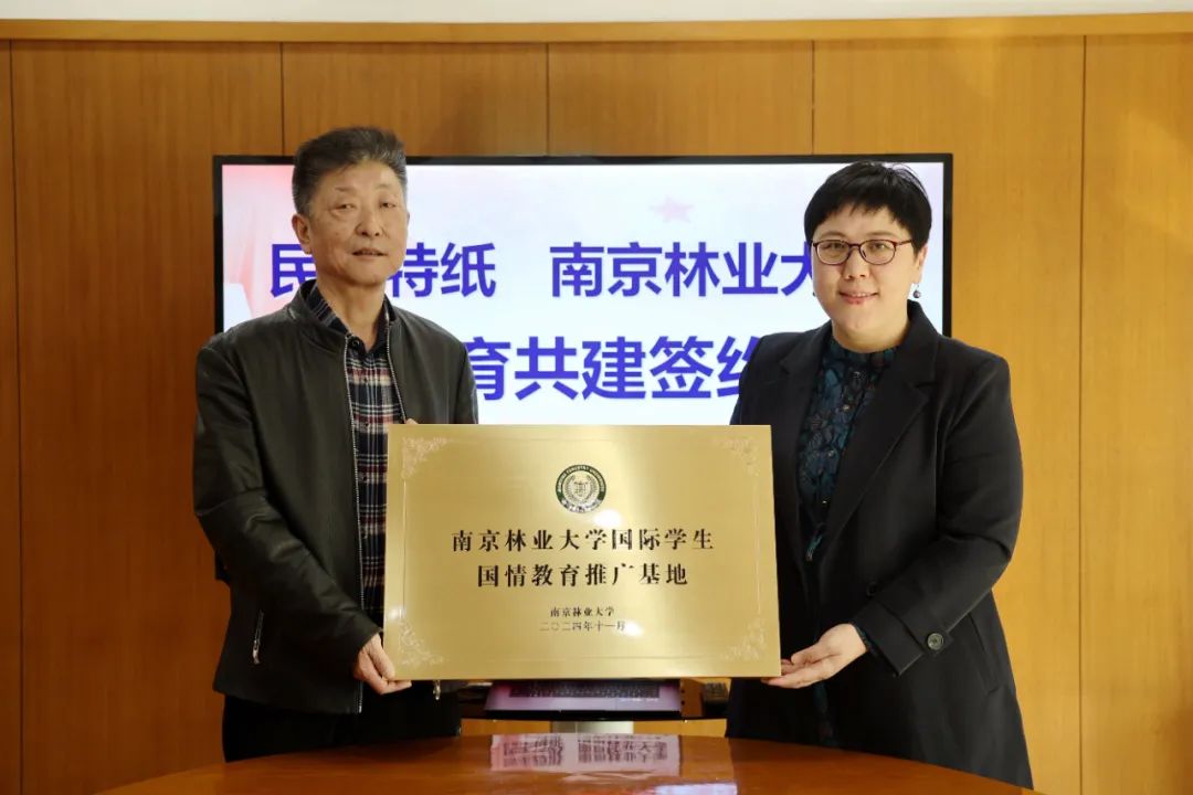 会上,曹继华和任浩代表共建双方签订《国际学生国情教育基地合作协议书》,任浩为民丰特纸授予“南京林业大学国际学生国情教育推广基地”牌匾。