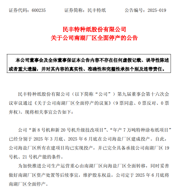 同日,民丰特纸公布,公司“新8号机和新20号机升级技改项目”、“年产7万吨特种涂布纸项目”已经分别于2025年3月底、2025年6月底在公司海盐厂区建成投产。自此,公司海盐厂区所有在建项目均已实现投产,并已完全具备承接公司南湖厂区19号机、21号机产能的条件。