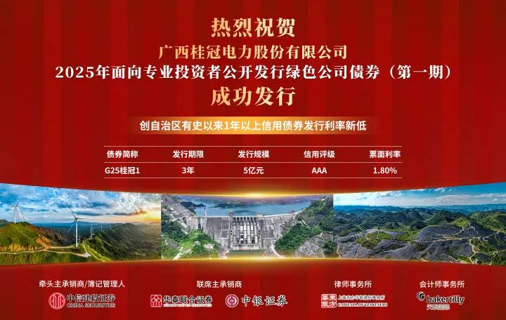7月9日,桂冠电力面向专业投资者公开发行2025年第一期绿色公司债券5亿元,创广西有史以来1年以上信用债券发行利率新低。