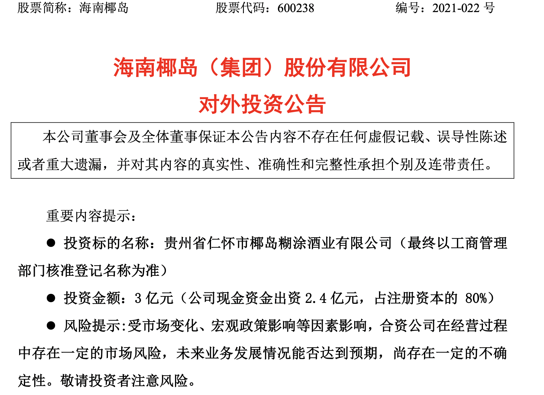 这样的解释并未消弭业界的质疑。4月27日,海南椰岛发布对外投资公告,称其全资子公司海南椰岛酒业发展有限公司(以下简称“椰岛酒业”)拟与糊涂酒业共同出资设立贵州省仁怀市椰岛糊涂酒业有限公司。其中椰岛酒业以现金出资2.4亿元,占注册资本的80%,椰岛酒业本次对外投资资金来源为自有及自筹资金。糊涂酒业以0.6亿元的大曲坤沙酱酒实物方式出资,占合资公司注册资本的20%。