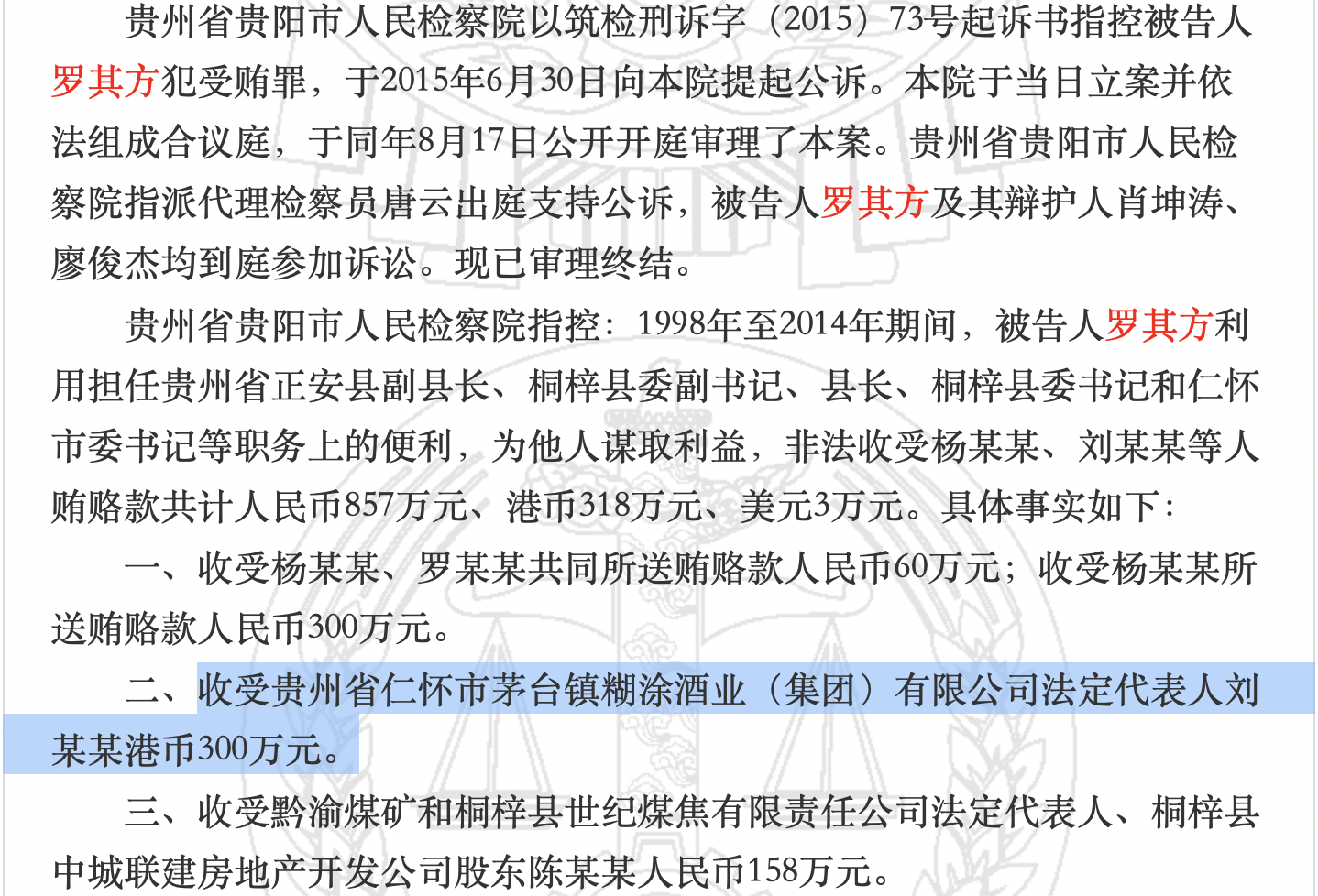 不仅如此,糊涂酒业还涉及行贿案件。据贵州省贵阳市中级人民法院2016年12月8日发布的原仁怀市委书记房国兴受贿案和罗其方受贿案刑事判决书,糊涂酒业的行贿行为均被列在判决书的显著位置。其中房国兴受贿案中,房国兴收受糊涂酒业法定代表人刘某某人民币249.5411万元和价值人民币90.8万元的大众牌途锐车一辆;罗其方受贿案中,罗其方收受糊涂酒业法定代表人刘某某港币300万元。根据天眼查消息,糊涂酒业法定代表人为刘清明,与海南椰岛对外投资公告中所公示的糊涂酒业法定代表人一致。