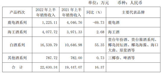 2022年上半年,公司酒类产品实现收入2.26亿元,同比增加16.37%。其中,白酒产品实现收入1.65亿元,同比增长55.35%。