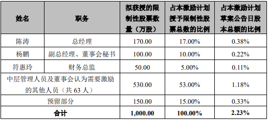 具体来看,本激励计划拟向激励对象授予限制性股票数量为1000万股,占公司总股本的2.23%。其中首次授予限制性股票850万股,占激励计划拟授予权益总额的85.00%;预留授予150万股,占本激励计划拟授予权益总额的15.00%。