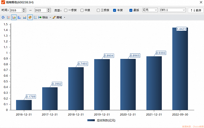 近几年海南椰岛资金流并不健康。2016年起,公司营业收入波动较大,净利润则是赚一年亏一年的状态。与此同时,公司应收账款逐年增加,到2022年三季度末已到达近六年的新高。