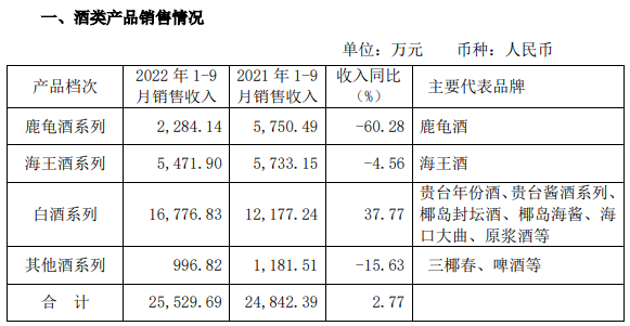 海南椰岛曾披露2022年前三季度经营数据。其中,鹿龟酒系列收入同比下滑超60%,海王酒系列收入同样下滑。值得注意的是,2022年上半年公司白酒系列销售收入为1.65亿元。以此测算,2022年第三季度公司白酒系列销售额仅为300万元。