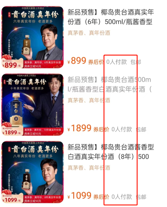 但酒业内参查阅椰岛淘宝官方旗舰店发现,由于和伟代言的售价为598元-1899元的多款贵台酒销量为0。