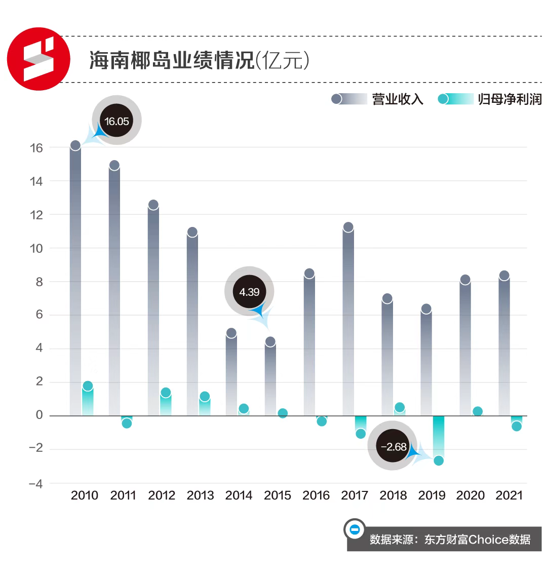 海南椰岛业绩的巅峰是在2010年。当年,营业收入为16.05亿元,归母净利润为1.96亿元,此后便是跌跌宕宕,惨惨淡淡,看不到起色。