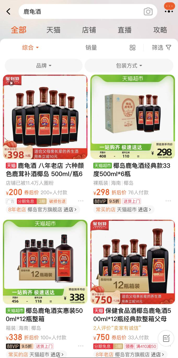 例如在天猫平台官方旗舰店中,鹿龟酒的月销量普遍只有100-200单之间,海王酒系列的销量也没好到哪里去。