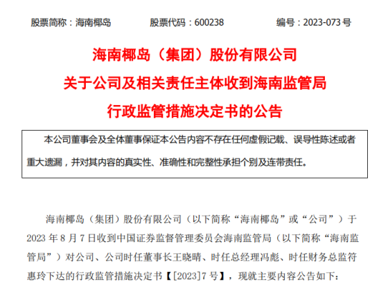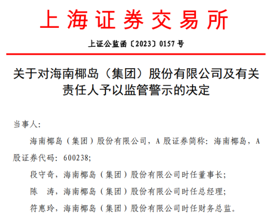 继被海南证监局出具警示函后,海南椰岛又因信披问题被上交所监管警示。