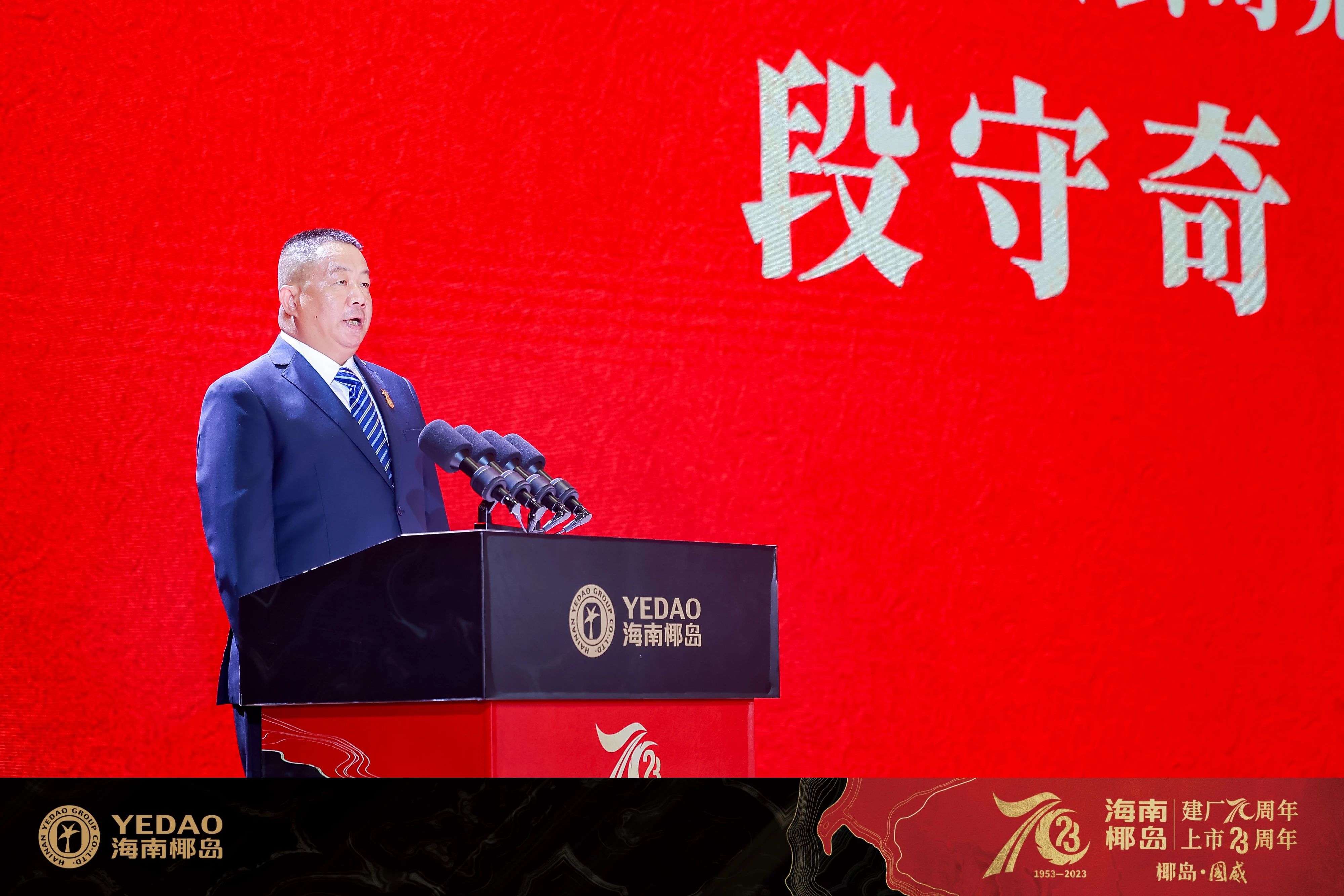 海南椰岛(集团)股份有限公司党委书记、董事长段守奇向前来参加庆典的领导、嘉宾表示热烈的欢迎,并回顾了海南椰岛风雨兼程而又荣光闪耀的70年。他指出:“建厂70周年、上市23周年间,海南椰岛在传承固本与突破创新中日益壮大,从一家地方国营酒厂发展成为辐射全国的老字号知名品牌。如今,海南椰岛重回国资怀抱,迎来了踏上新征程、再上新台阶的关键一年。站在新的历史起点上,海南椰岛将坚持‘传承中华养生智慧、共创健康中国’的使命追求,回归做酒初心,传承发扬鹿龟酿泡技艺,以匠心致初心,以初心致未来,全新出发,向着‘致力于成为世界一流的健康消费品综合运营服务商,缔造百年椰岛’的目标进发,不断开创海南椰岛新的辉煌。”