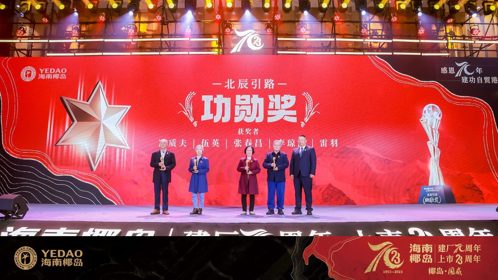 颁奖盛典现场共表彰“北辰引路——功勋奖”冯质夫、伍英、张春昌、李琼路、雷雨5人,“同心同行——杰出奖”梁明锋、王久明、杜永球、薛德志、王浩、桂军6人、“风雨同舟——卓越奖”何启惠、陈忠雄、苏史、林珍珠、李春长5人。