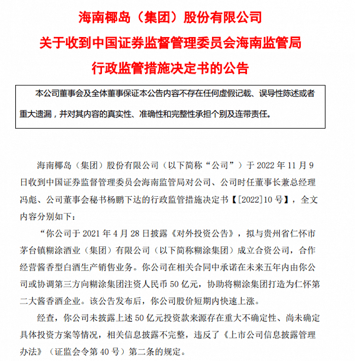 海南椰岛的注资公告也于2022年11月,因存在重大不确定性、尚未确定具体投资方案等理由,遭海南监管局开出警示函。