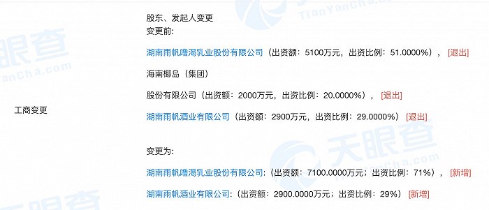 1月4日,界面新闻看到,海南椰岛股份有限公司(以下简称“海南椰岛”)退出了海南椰岛雨帆食品有限公司(以下简称“椰岛雨帆”)股东之列,退出前持股比例为20%。