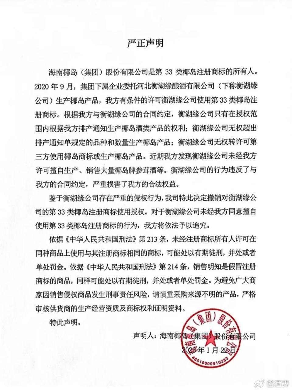 1 月 23 日,海南椰岛发布声明,指责委托生产企业河北衡湖缘酿酒有限公司未经许可,擅自生产、销售大量椰岛牌参茸酒,严重违反合同约定,损害其合法权益。为此,海南椰岛决定撤销对衡湖缘第 33 类椰岛注册商标的使用授权,并将依法追究其商标侵权责任。