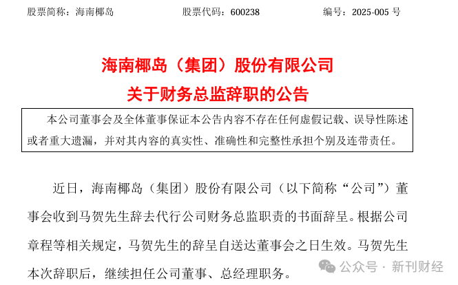 3月17日,海南椰岛发布重要人事调整公告显示,马贺主动提交辞呈,不再担任公司代行财务总监职务,但将继续保留董事及总经理的职位。