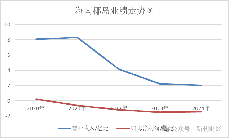 从近年数据来看,2020-2023年,海南椰岛归母净利润分别为0.24亿元、-0.6亿元、-1.18亿元和-1.49亿元,若加上2024年的亏损,近四年累计归母净利已亏损4.69亿元。与此同时,公司营收也呈萎缩态势。2021年,公司营收曾达到8.33亿元,但如今已降至约2亿元,同比降幅达75.39%。