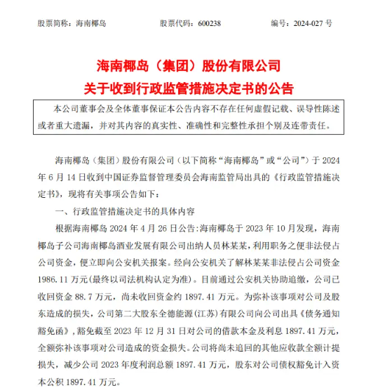 然而,就在马贺任职海南椰岛总经理后,原财务总监符惠玲、原监事、原独立董事、原监事会主席接连辞职,完善的架构再度空缺多岗。基于此,马贺代行财务总监职责。在他任职期间,海南椰岛因未及时披露员工职务侵占资金事项,遭到了上交所的警示,对相关责任人给予批评,并记入资本市场诚信档案。