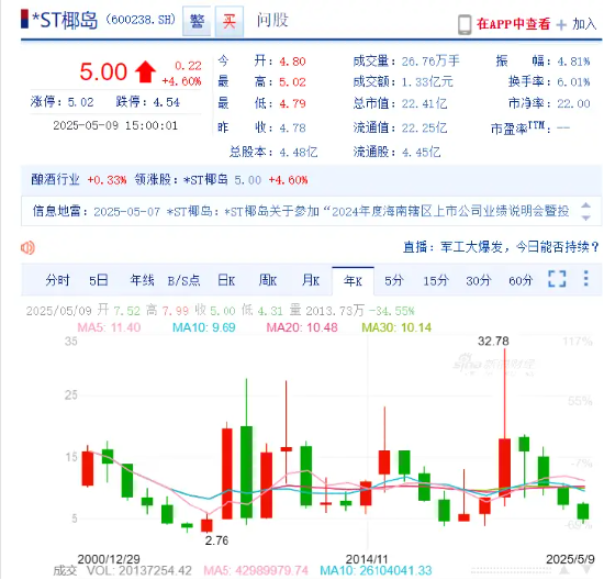 如今海南椰岛的总市值仅22亿左右。在资本市场上,公司股价表现低迷,相比最高32.78元的股价,跌去了84.7%,投资者信心严重受挫。
