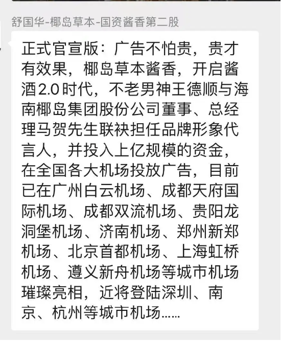 在网传截图中,海南椰岛集团生态酒事业部总裁、海南椰岛生态酒总经理、海南椰岛集团贵州酒业CEO舒国华甚至在群聊中公开支持马贺,并表示此次两人的联动宣传投资了上亿规模的资金。