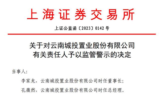 中新经纬7月26日电云南城投26日收到上交所监管函,因未及时披露涉诉事项,上交所对云南城投时任董事长李家龙、时任总经理孔薇然予以监管警示。
