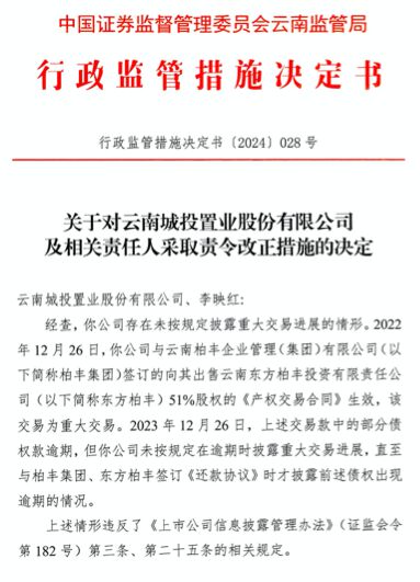 12月9日,云南证监局下发关于对云南城投置业股份有限公司(以下简称“云南城投”或“公司”)及相关责任人采取责令改正措施的决定。因云南城投存在未按规定披露重大交易进展的情形,云南证监局现决定对云南城投及李映红采取责令改正的监督管理措施,并记入证券期货市场诚信档案。