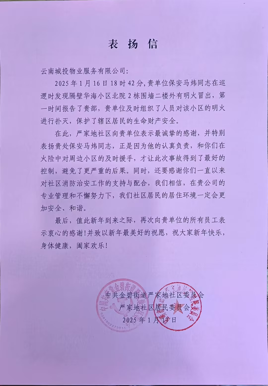 近日,云城服务收到来自严家地社区的一封表扬信,对云城服务物业工作人员在火灾紧急关头挺身而出、迅速行动的英勇行为和专业高效的应急处理水平表示高度赞扬和诚挚感谢。