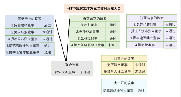 五莲云克提议的免去相关人员董事、监事的提案获得通过,提名严凯聃为非独立董事的提案未获通过。三盛宏业与五莲云克联合提名的一名非职工监事议案未获通过。看似“凑热闹”的太合汇提名章超斌为非独立董事的议案却获得了通过,江西瑞京提出的四个议案均折戟。