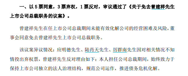 2022年3月19日,上市公司召开董事会会议,该次会议由三盛宏业提议召开,由董事长凌云召集和主持,会议以5票同意,3票弃权,1票反对,审议通过了免去曾建祥上市公司总裁职务的议案。公告显示,曾建祥在任上市公司总裁期间未能有效化解公司的经营困难及风险,董事会同意免去曾建祥上市公司总裁职务。