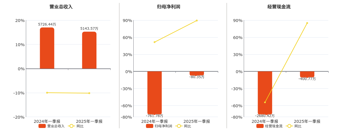 公司营业总收入为5143.57万元,较去年同报告期营业总收入减少582.87万元,同比较去年同期下降10.18%。归母净利润为-80.35万元。经营活动现金净流入为-400.77万元。