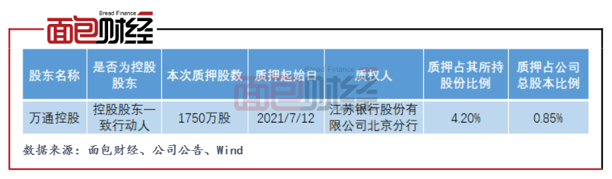 2021年7月13日万通发展发布公司股东股份质押公告,万通投资控股股份有限公司(以下简称“万通控股”)持有公司股份4.17亿股,是公司第二大股东。万通控股将1750万股公司股份质押给江苏银行北京分行,质押融资资金将用于补充流动资金。