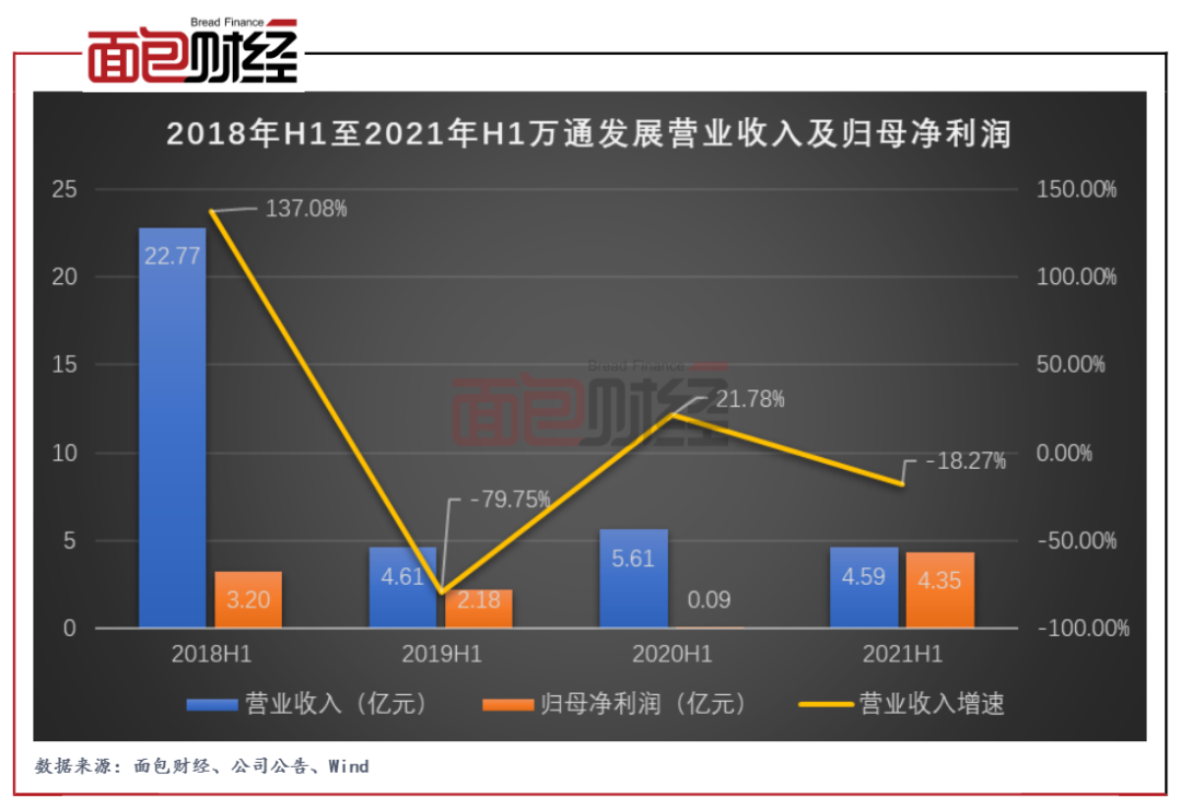 近日,北京万通新发展集团股份有限公司(以下简称“万通发展”或“公司”)发布2021年半年度报告。上半年公司实现营业收入4.59亿元,同比下降18.27%;实现归属上市公司股东的净利润为4.35亿元,同比增长4822.64%。