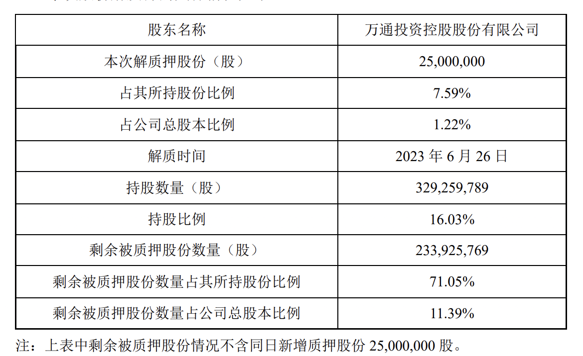 此外,万通控股本次解质押股份已于同日质押给盛京银行股份有限公司,质押时间自2023年6月26日至2024年6月30日。