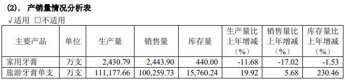两面针2021年产销情况可以印证这一点。年报显示,公司家用牙膏销量为2433.9万只,产销量较同期均下滑10%以上;而旅游牙膏销量为10.03亿只,同比增长5.68%。