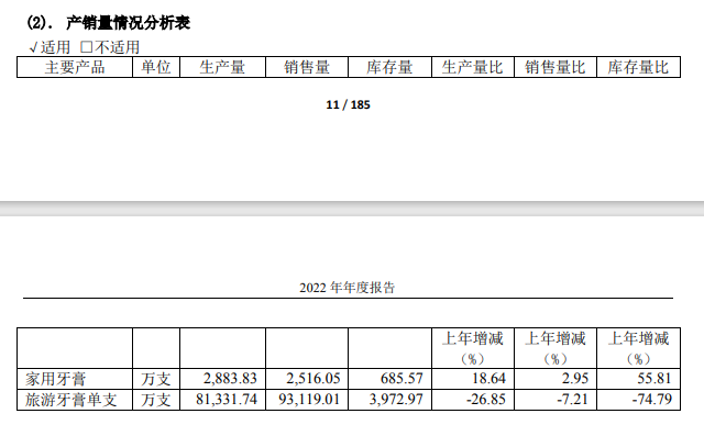 从主要产品产销情况来看,两面针家用牙膏2022年销售量为2516.05万支,同比增长2.95%;而旅游牙膏销售量为93119.01万只,同比减少7.21%,同时生产量也同比减少了26.85%。