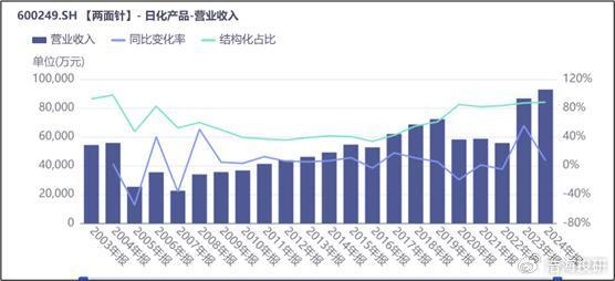 2024年,日化产品创收占比为88.21%、药品创收占比为9.86%,其他创收占比为1.93%。两大板块中,日化为核心。虽为核心,但却显得日渐颓废。