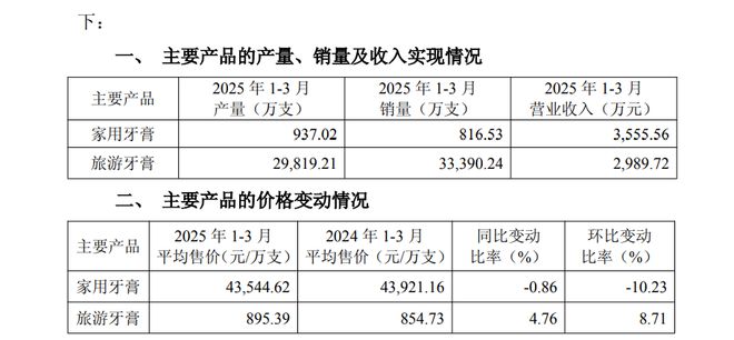 从两面针披露的2025年和2024年的第一季度主要经营数据来看,其两大主要产品的营收和价格同比变动并不大。两面针2025年家用牙膏的营收为3555.56万元,同比增长8.48%,平均售价同比减少-0.86%;旅游牙膏的营收为2989.72万元,同比增长13.89%,平均售价同比增长4.76%。