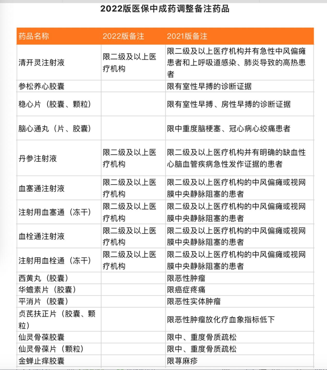 中恒集团(证券代码600252)旗下梧州制药的注射用血栓通(冻干)、血栓通注射液的医保支付条件由2021年“限二级及以上医疗机构的中风偏瘫或视网膜静脉阻塞患者”调整为2022年“限二级及以上医疗机构”,这意味着血栓通在医保报销范围里“取消对药品适应症限制条件”,恢复至药品说明书范围。