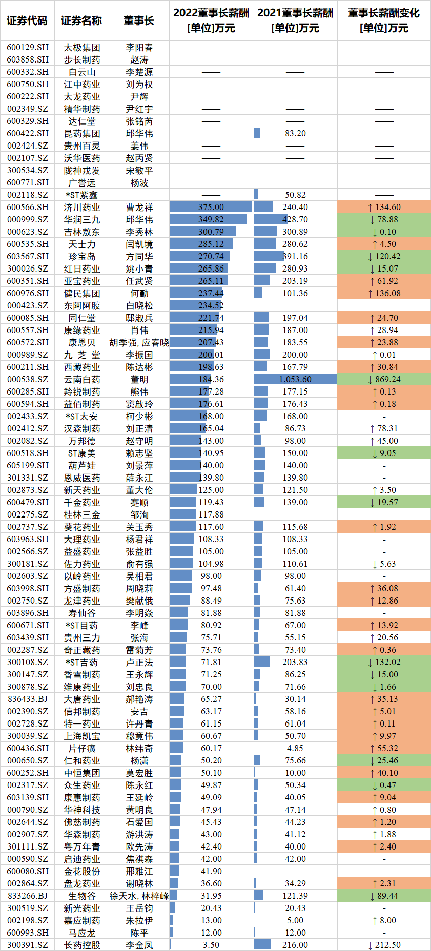 董事长薪酬:云南白药董明年薪惊天降幅869.24万元,济川药业曹龙祥年薪375万元行业最高