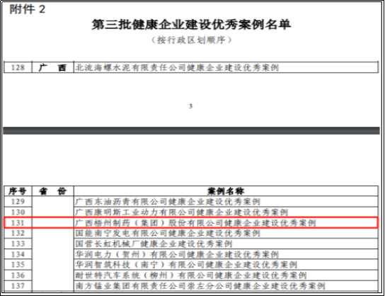 近日,国家卫生健康委办公厅印发《关于公布第三批健康企业建设优秀案例名单的通知》,广西梧州中恒集团股份有限公司旗下广西梧州制药(集团)股份有限公司入选国家卫生健康委第三批健康企业建设优秀案例名单。