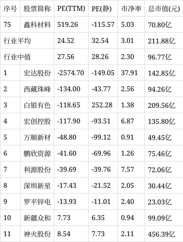 从行业市盈率排名来看,公司所处的有色金属行业市盈率平均24.52倍,行业中值27.56倍,鑫科材料排名第75位。