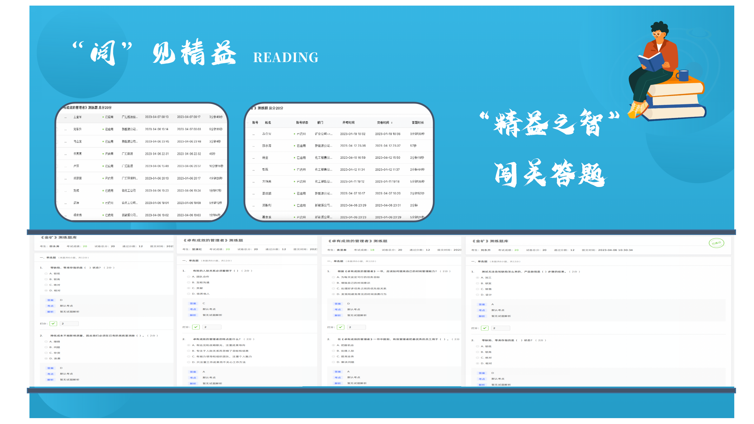自读是基础,测试是巩固。活动设置了“精益之智”测试环节,通过20道题目检验和巩固学员的阅读学习效果,帮助学员进一步将精益思想学懂、弄通、悟透,内化于心,外化于行。