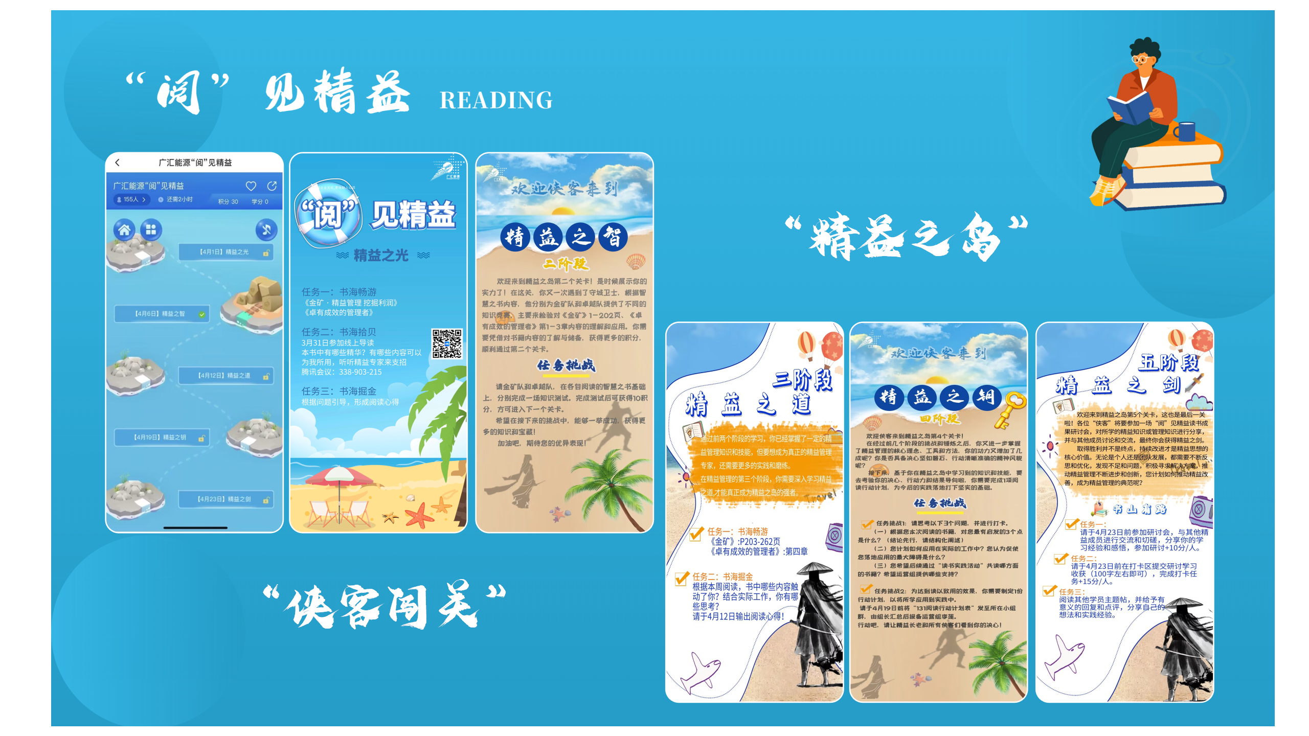 此次共读活动由广汇能源人力资源部主导,以阅读任务阶段化、闯关PK趣味化、读学内容实用化为原则,以“精益之岛”寻宝探索为任务主线,依托线上平台,引导145名学员按照“自读+导读+深读+研读+践行”的“1+3侠客闯关”的模式,共同研读了《金矿》和《卓有成效的管理者》两本经典书籍,不断深化理解,真正把知识变成实践力量,通过精读活动打造学习型企业,以实际行动践行“精益化管理”理念。