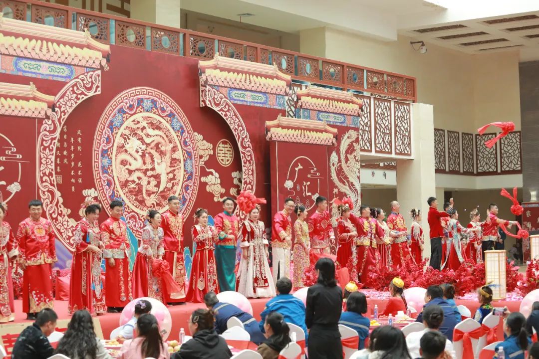 仪式结束后,新人们在广汇培训中心共进喜宴。期间,蒙眼尖叫鸡、猜歌名影名、“心有灵犀一点通”等多个游戏将欢乐的气氛拉满,11对新人喜笑颜开,赢取了一份份精美的小礼物,将幸福和喜悦定格在这难忘的时刻。
