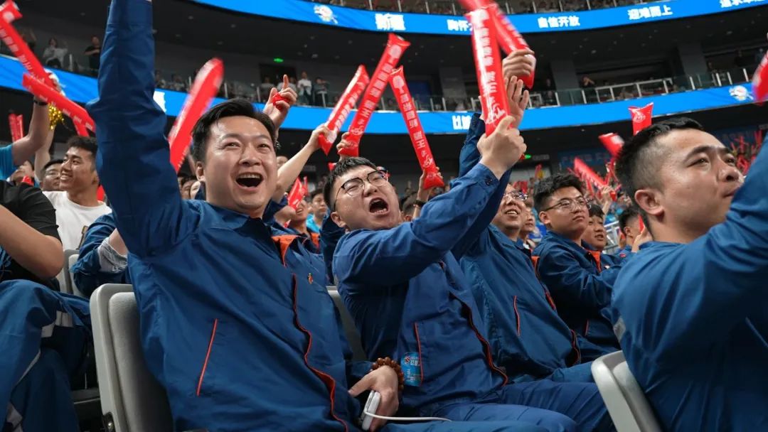 5月20日,广汇能源组织50名毛湖煤炭煤化工基地一线员工代表到CBA季后赛总决赛新疆伊力特主场迎战辽宁本钢的比赛现场,为新疆飞虎男篮加油助威。