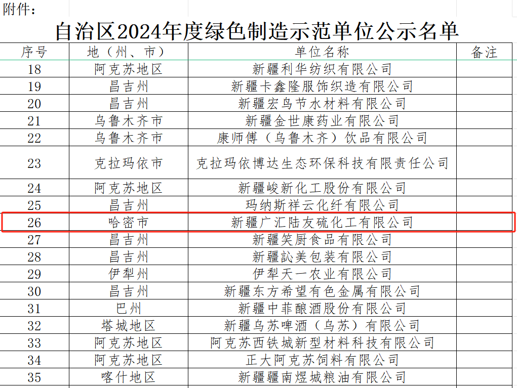 8月7日,自治区工信厅发布了《关于自治区2024年度绿色制造示范单位名单的公示》,广汇陆友硫化工公司入选绿色工厂名单。
