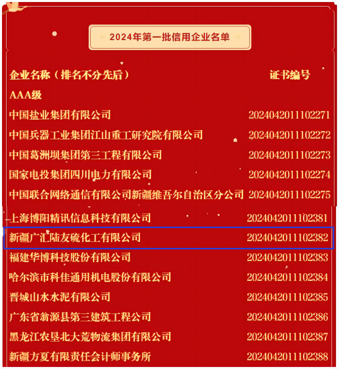 7月23日,中国企联发布2024第一批信用企业评价榜单,广汇陆友硫化工公司荣获最高级别的3A信用评价。