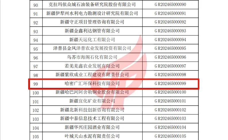 11月12日,全国高新技术企业认定管理工作领导小组办公室发布了《对新疆维吾尔自治区认定机构2024年认定报备的第一批高新技术企业进行备案的公告》,广汇环保科技公司荣列其中。