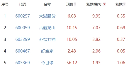 其中,大湖股份、古越龙山、苏盐井神、好当家、今世缘位列板块涨幅前五位,涨幅分别为9.95%、7.07%、3.82%、2.06%、1.93%。