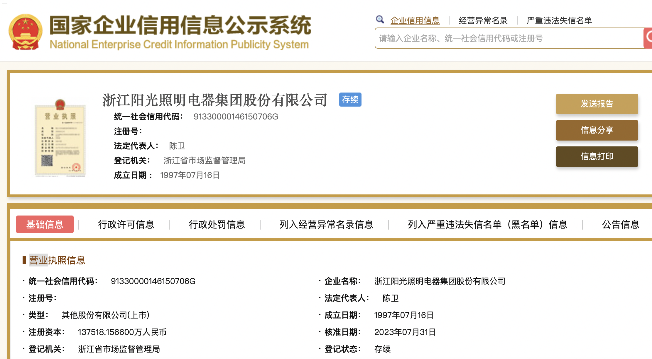 8月2日,浙江阳光照明电器集团股份有限公司(以下简称“阳光照明”)注册资本发生变更,从14.15亿元减少至13.75亿元。